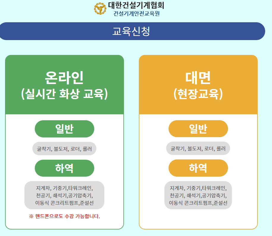 안전교육은 크게 일반건설기계와 하역운반기계로 구분됩니다.