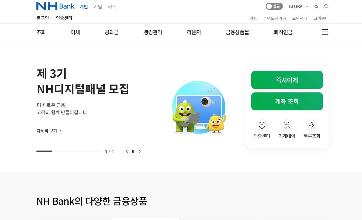 2026년 농협 인터넷뱅킹은 보안 사고 예방을 위해 다중 인증 시스템을 채택하고 있습니다. 사용자는 금융인증서, 공동인증서, 'NH인증서' 중 편의에 따라 인증 수단을 선택할 수 있으며, NH인증서의 활용 비중이 높아지는 추세입니다.