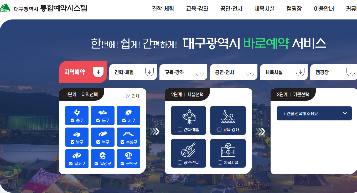 대구광역시 통합예약시스템은 대구시 산하 기관 및 부서에 분산되어 있던 다양한 공공 예약 서비스를 하나의 홈페이지에서 모두 처리할 수 있도록 구축된 온라인 통합 플랫폼입니다.