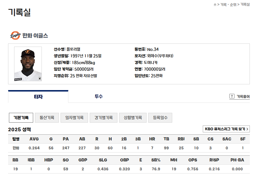 한화 이글스가 2025년 시즌을 맞아 영입한 도미니카 공화국 출신의 외야수 에스테반 플로리얼이 KBO 리그에서 주목받고 있습니다. 메이저리그 경험을 바탕으로 한국 야구에 적응하며 팀의 핵심 선수로 자리잡아가는 플로리얼의 현재 모습과 성과를 자세히 살펴보겠습니다.