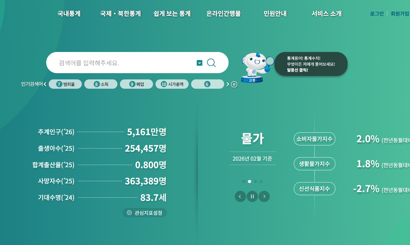 - 주제별 탐색: 메뉴에서 국내통계 → 주제별 통계 경로로 들어가면 분야별 통계를 체계적으로 탐색할 수 있다.